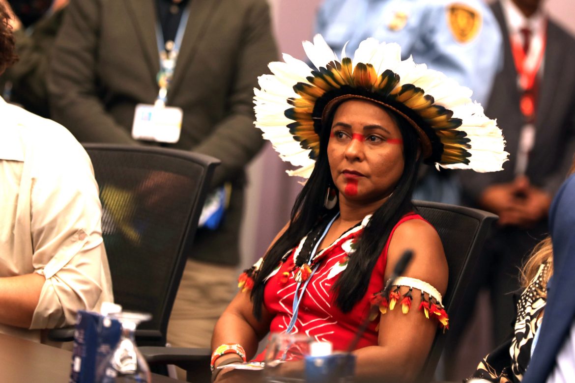 Ao aldo de outras lideranças indígenas brasileiras, Puyr reforçou a importância da inserção da sociedade civil nos espaços de discussão do governo. Fotos: Kiara Worth / UNFCCC, COP27